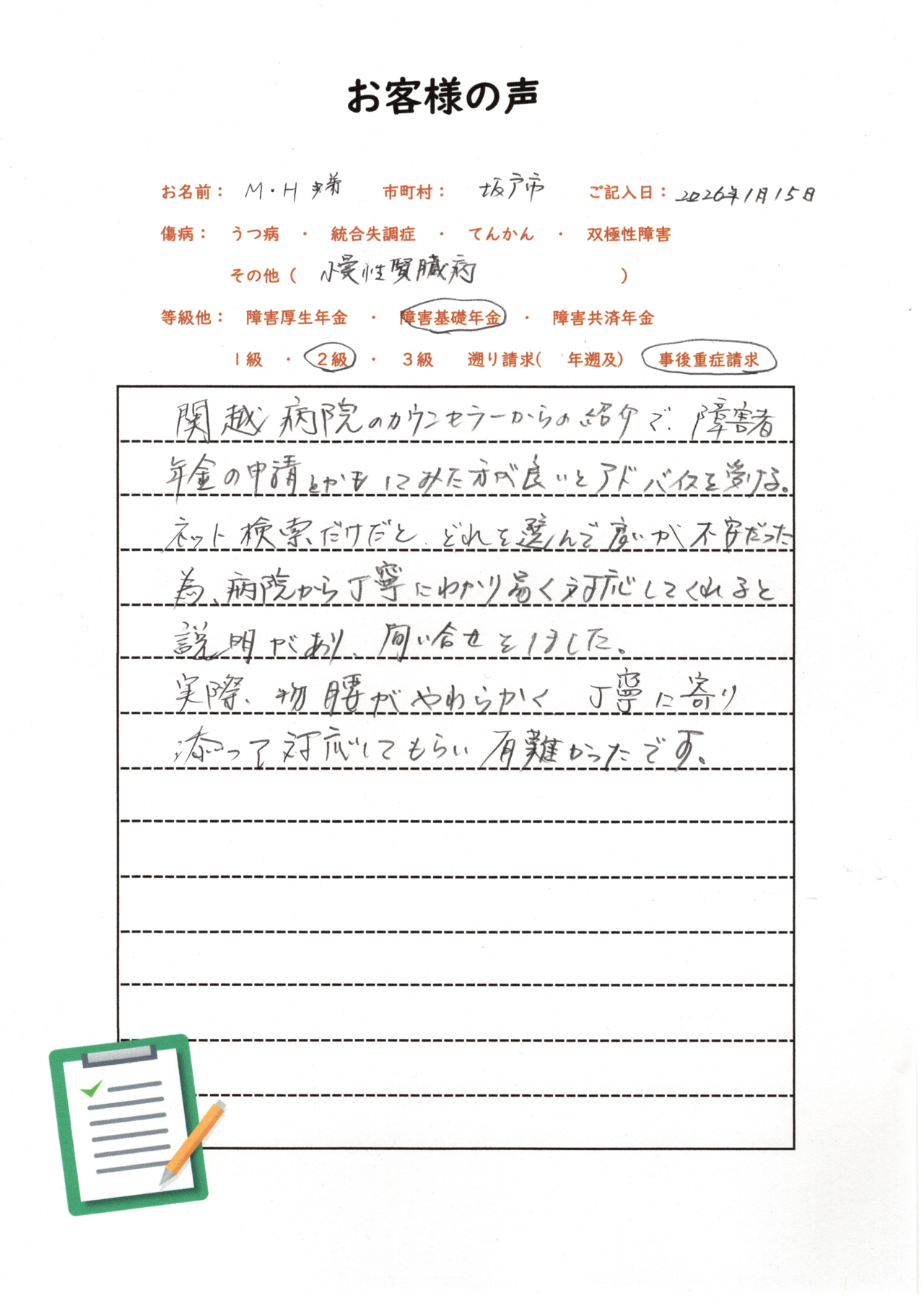 病歴・就労状況申立書の書き方が分からず、書いて頂けるとのことで松山先生に依頼しましたが正解でした。