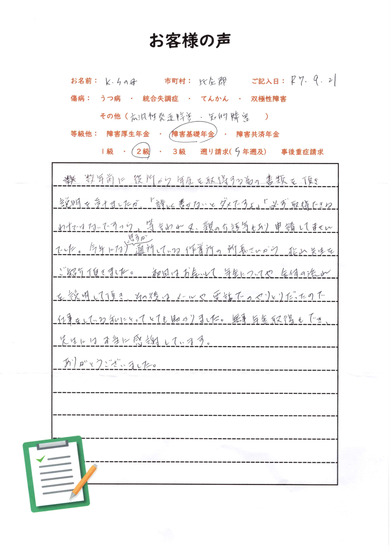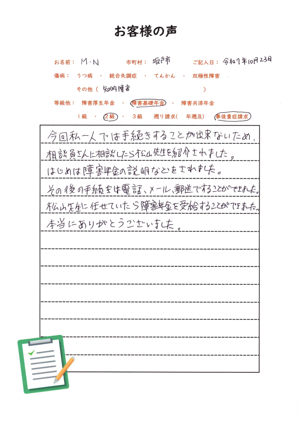 今回、障害基礎年金の2級受給決定となりました事、本当に有難うございました。これもすべて松山先生のおかげとしかいいようがありません。